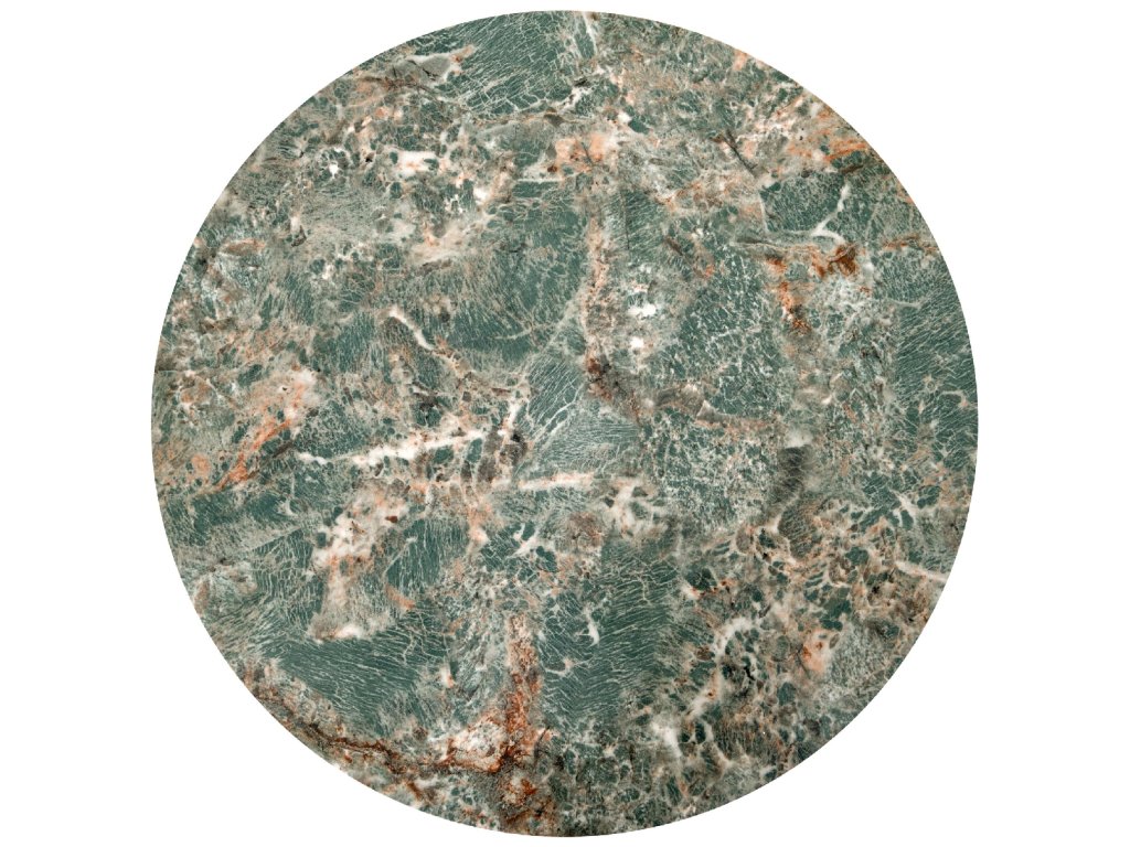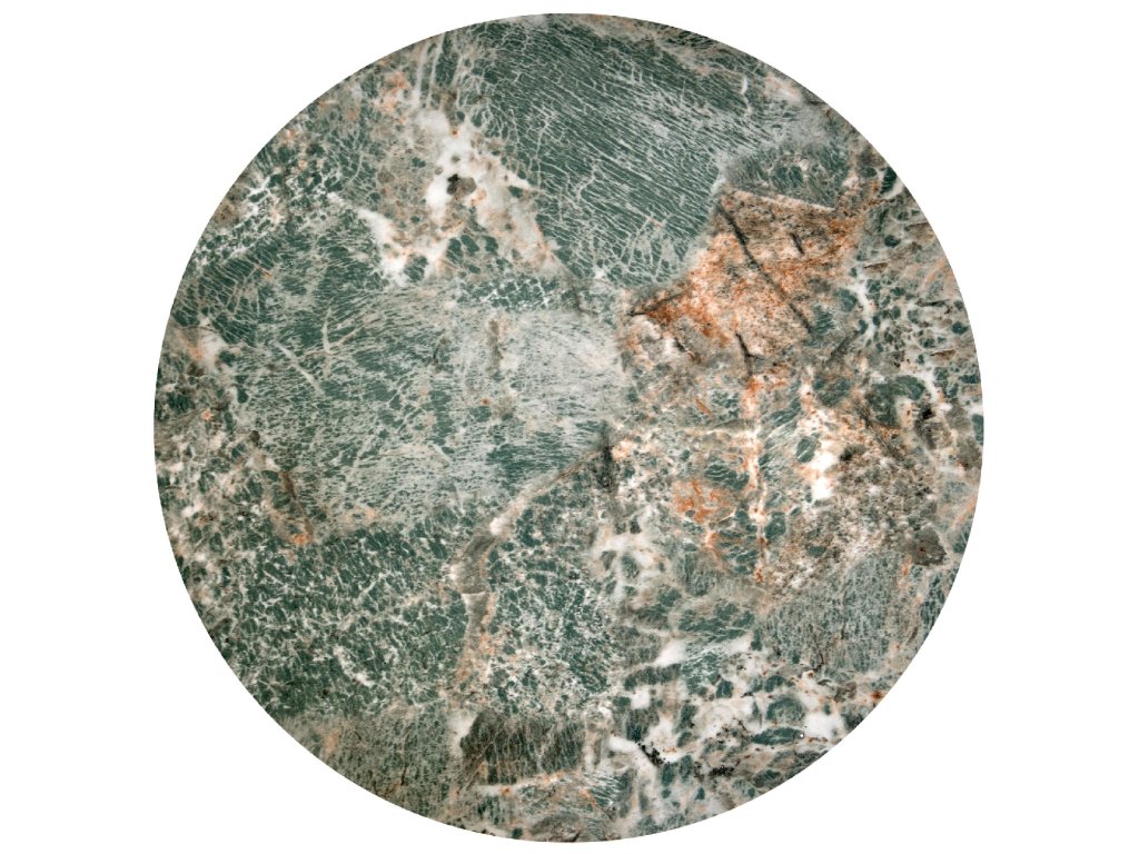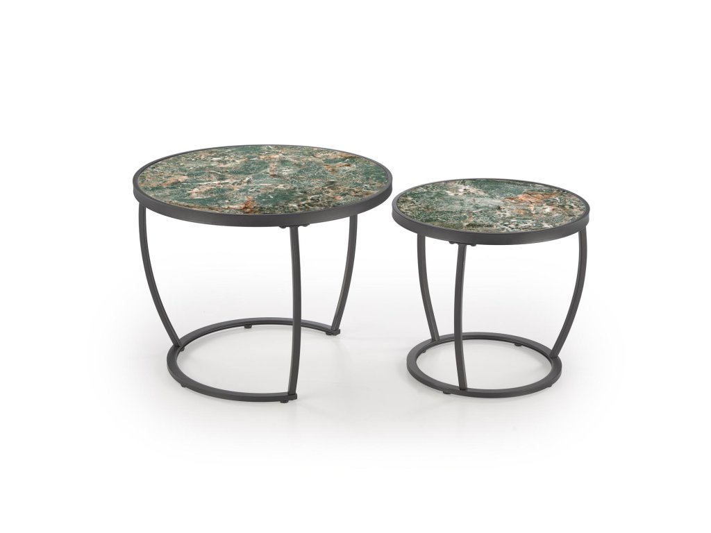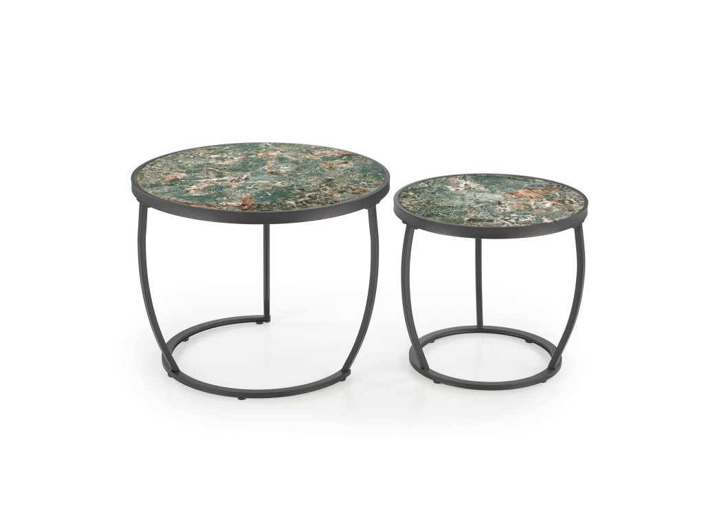 Elegantní sada dvou kulatých konferenčních stolků. Deska je vyrobena ze slinutého kamene v barvě zelený mramor. Konstrukce stolku je z ocele.