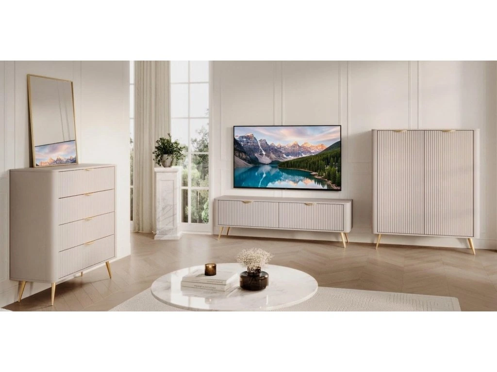 Moderní nábytek LANTE je vyrobený z kvalitního lamina tloušťky 16 mm v béžové barvě. Dvířka a čela šuplíků jsou z profilované MDF tloušťky 18 mm. Kovové nožky a úchytky jsou ve zlaté barvě. Každý kus tohoto nábytku je vyrobený s důrazem na kvalitu provedení, nábytek LANTE má ABS hrany a všechny šuplíky mají pojezdy s plný výsuvem s kuličkovými ložisky. Nábytek je dodávaný v demontovaném stavu s podrobným návodem k sestavení.