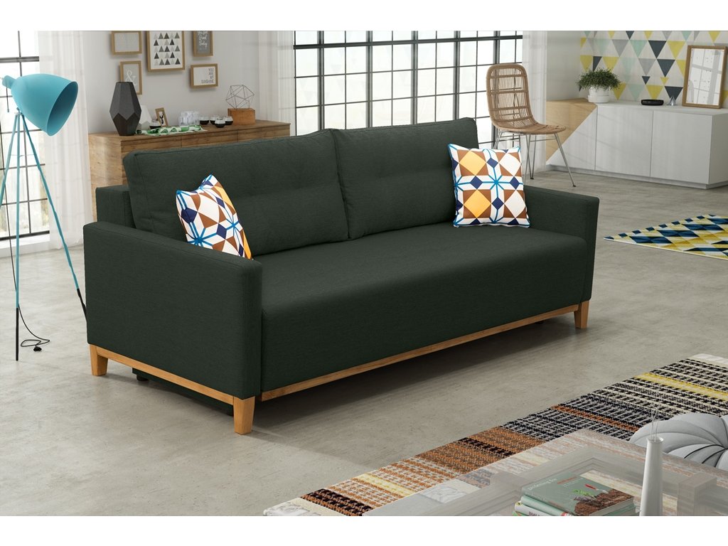 Pohovka Aristo ve skandinávském designu zaujme především svým jednoduchým a funkčním zpracováním. Pohovka je rozkládací a samozřejmostí je i úložný prostor, který poslouží např. na lůžkoviny. Jednoduchým rozložením pomocí automatu, získáte lůžko k příležitostnému přespání Vaší návštěvy. Návod na rozložení můžete shlédnout v krátkém gifu v doplňkových fotografiích. Naleznete tam také detailní rozměry pohovky. Pohodlí při sezení zajišťuje výplň sedáku, která je složena z pružin bonell a kvalitní PUR pěny a také opěrné polštáře, které jsou odnímatelné a můžete si je přizpůsobit podle svých potřeb. Pohovku nabízíme v několika barevných provedeních. Úvodní fotografie je ilustrační, vzorek látky, ve které bude pohovka dodána, je vyobrazen v doplňkových fotografiích. Moření dřeva není možno zvolit. V ceně pohovky jsou 2 malé vzorované polštářky, které jsou vyobrazené na fotografii. Ostatní vyobrazené doplňky a dekorace nejsou v ceně.
