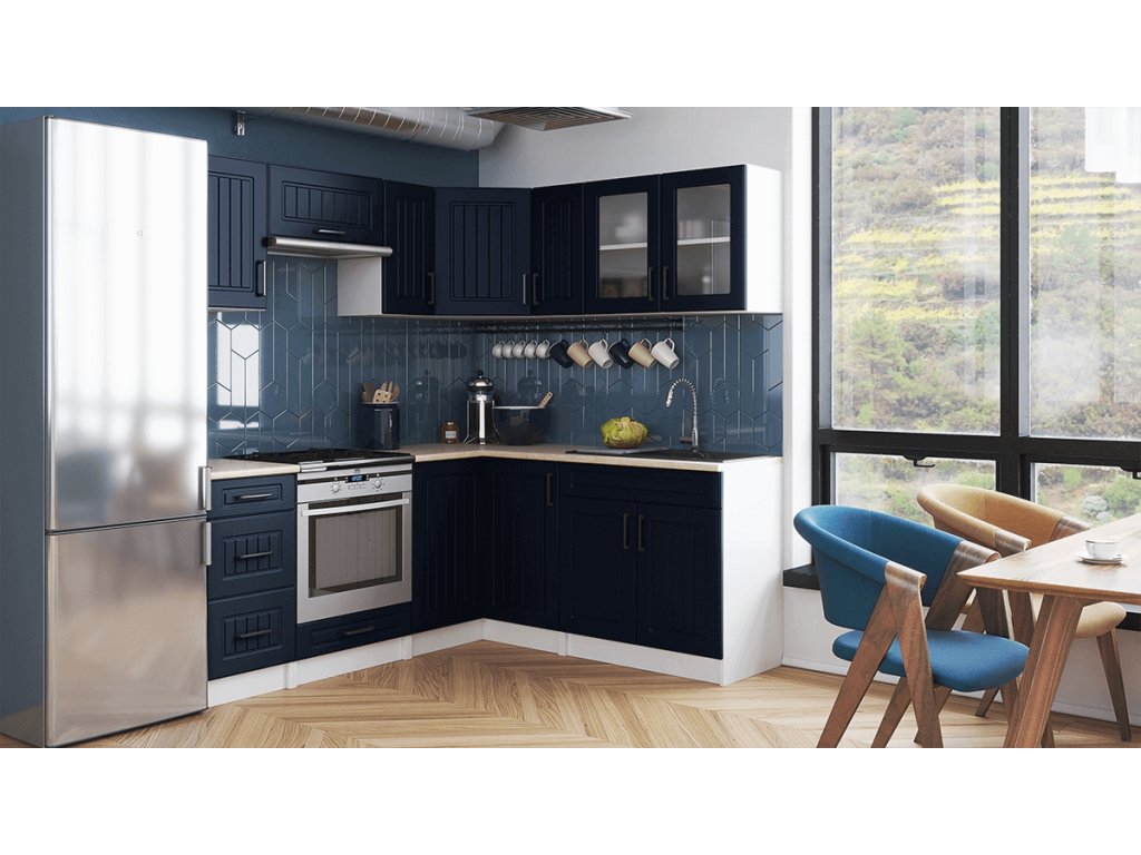 Kuchyňská linka Romana je vyrobená ve venkovském stylu, který se hodí do kuchyně v paneláku i v rodinném domě. Tento styl má jedinečnou schopnost proměnit Vaši kuchyň v útulnou a zároveň funkční místnost, kde bude radost vařit i péct. Rohová kuchyňská linka Romana nabízí dostatek úložného i pracovního prostoru. Kuchyňské skříňky jsou samostatné, takže si je můžete sestavit podle potřeby tak, jak Vám to vyhovuje. Korpusy skříněk jsou vyrobené z lamina 18 mm s hranami ABS a dvířka jsou MDF 16mm. Všechny skříňky jsou dodávány v demontu. Součástí balení je montážní plánek včetně všech potřebných spojovacích prvků. Cena je uvedena za sestavu vyobrazenou na úvodní fotografii BEZ PRACOVNÍ DESKY, s úchytkami, které jsou vyobrazeny v doplňkových fotografiích. Pracovní desku lze dokoupit nad každou skříňku zvlášť podle její šíře. Vyobrazené spotřebiče, dřez, baterie, doplňky a dekorace nejsou v ceně. Kuchyň bude dodaná s bílými korpusy a dvířky v dekóru tmavě modrá.