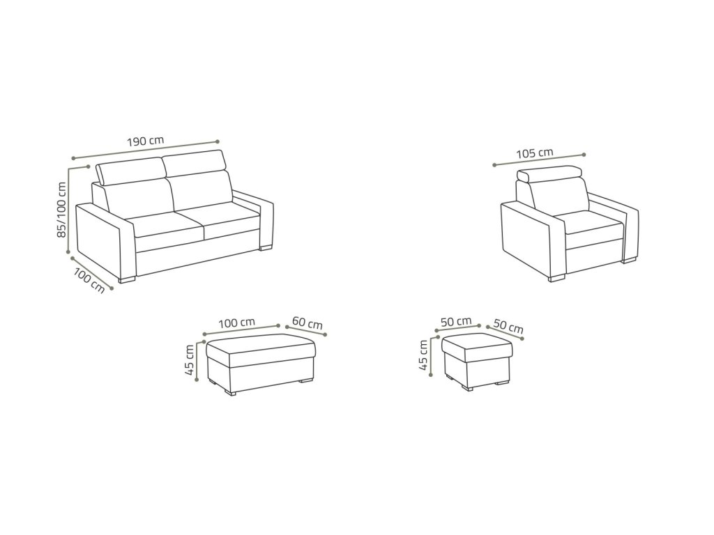 Rozměry trojsedu: 190 x 100 cm křeslo: 105 x 100 cm