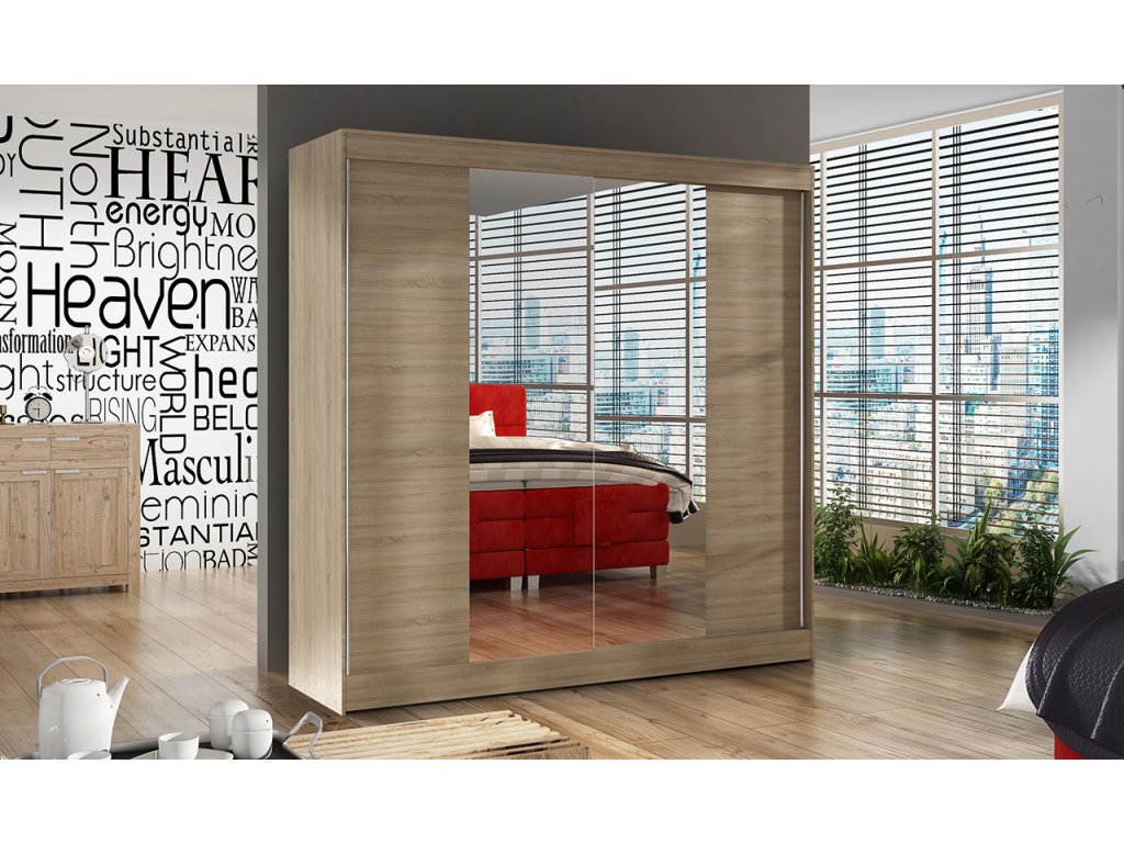 Skříň je vyrobena z kvalitního lamina. Díky svému vnitřnímu uspořádání nabízí dostatek úložného prostoru, posuvné dveře šetří prostor a zrcadlo ho opticky zvětšuje. Skříň je vhodná do ložnice, dětského nebo studentského pokoje, do předsíně i kanceláře. Vnitřní uspořádání skříně je vyobrazeno na fotografii. Skříň je dodávána v demontu. Součástí jsou i skleněná zrcadla, která jsou nalepena na dveřích skříně a také montážní plánek včetně všech potřebných spojovacích materiálů. Vyobrazené dekorace nejsou v ceně.