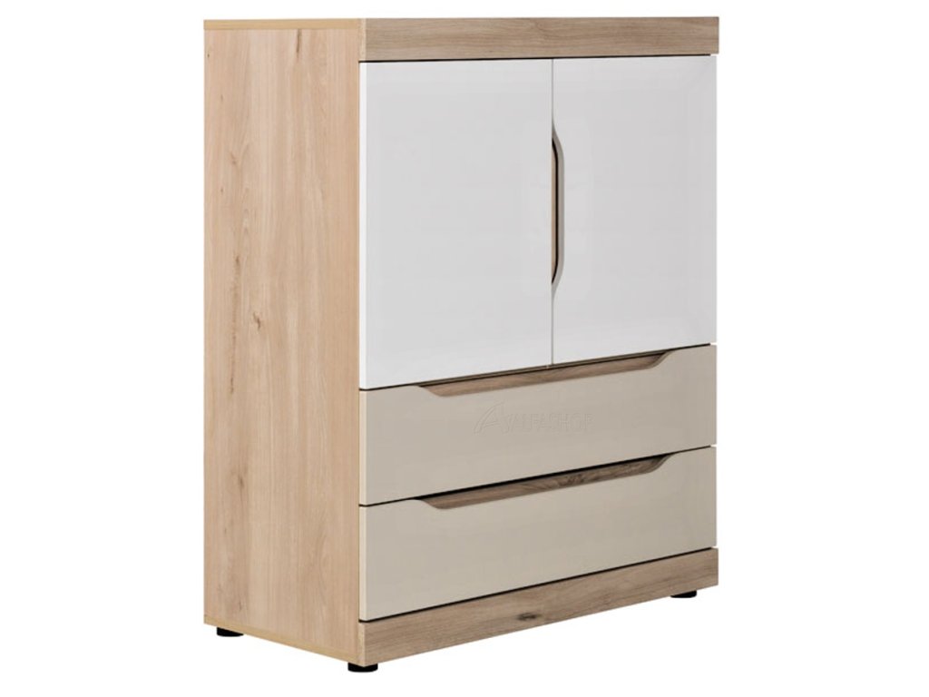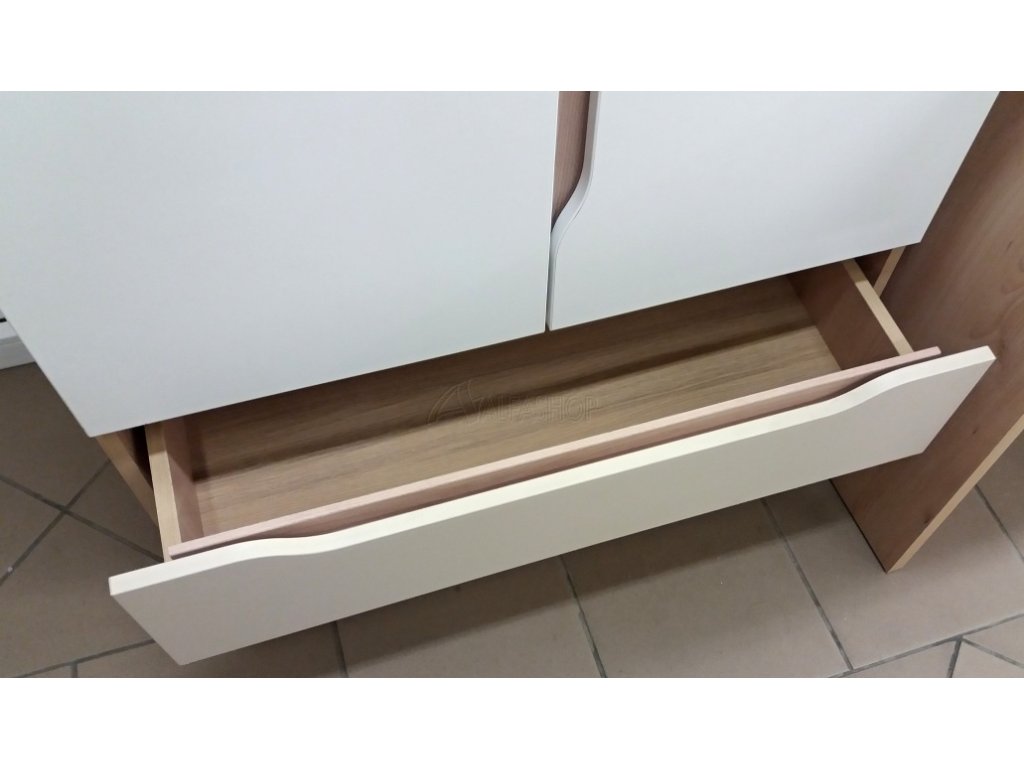 je vyrobena z LTD v barvě buk ibsen, dvířka jsou bílé a šuplíky v barvě champagne. Rozměr 80x101x41, dodáváno v demontu.